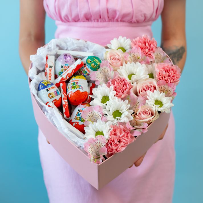 Описание товара "Сердце: ромашки, роза, шоколад"