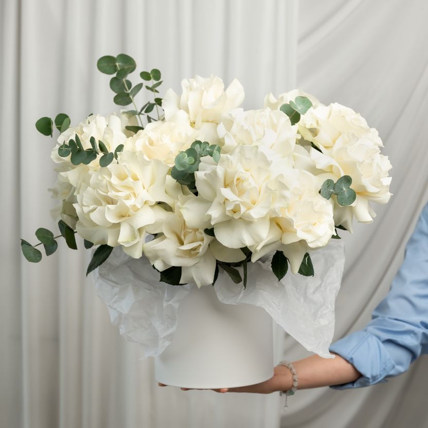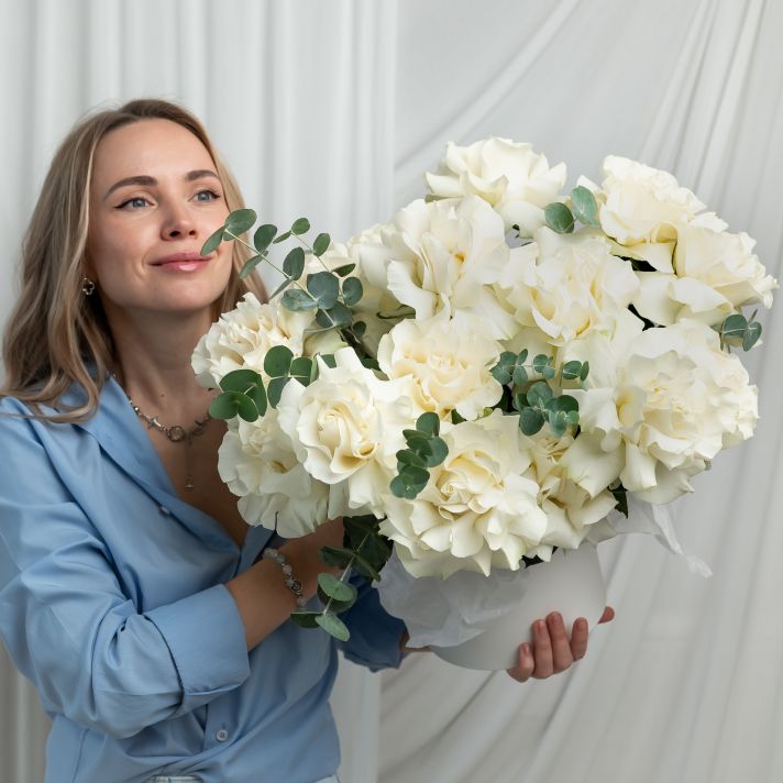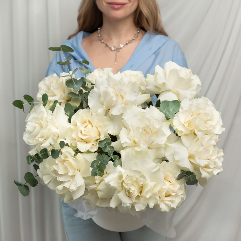 Описание товара "15 французских роз в шляпной коробке (сорт Нина)"