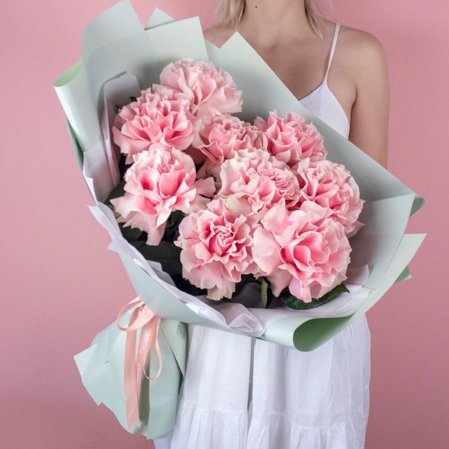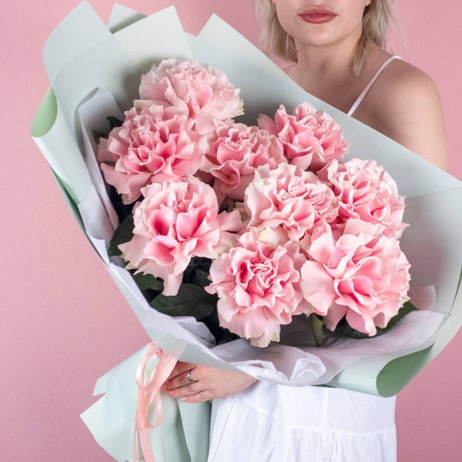 Букет из 9 нежно-розовых французских роз в мятной упаковке