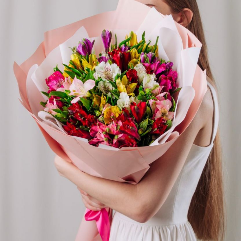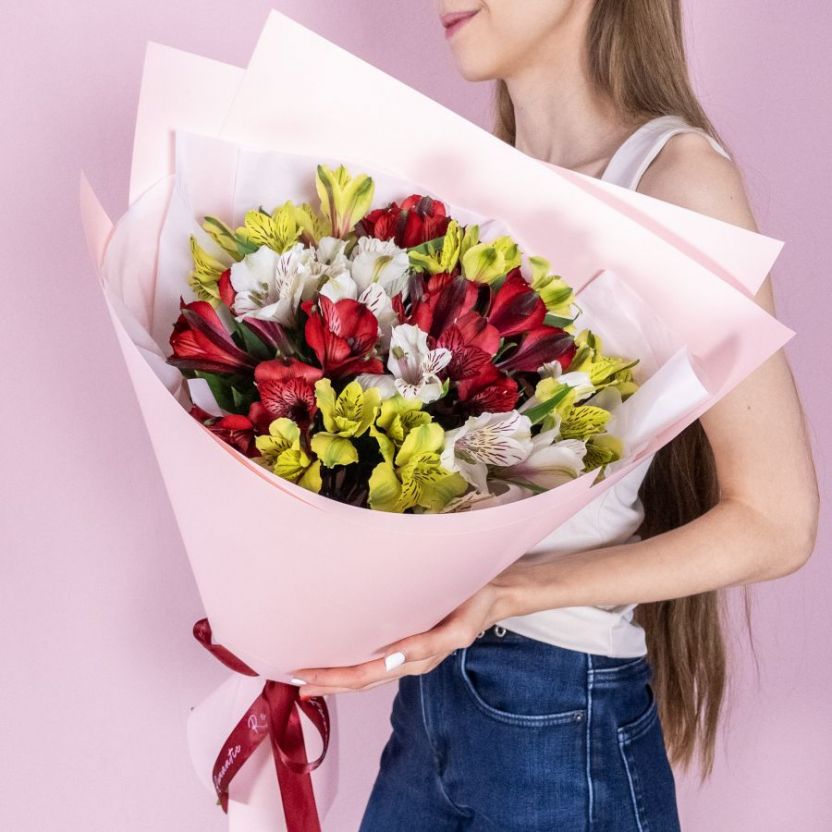 Состав: альстромерия, пленка матовая, тишью, лента атласная.