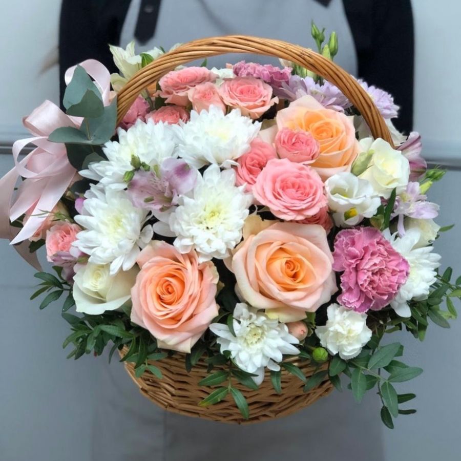 Нежная композиция в бело-розово-персиковой гамме, оформленная в корзине.