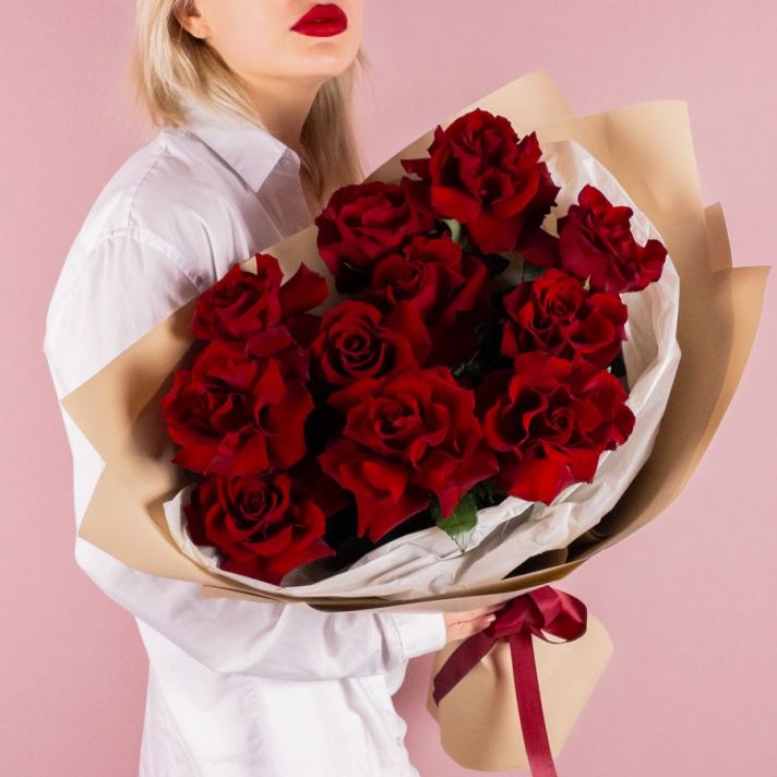 Стильный и стойкий монобукет из 11 альстромерий микс в крафт бумаге с добавлением тематического топпера.
