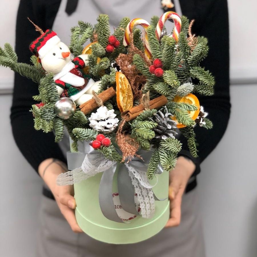 В составе: датская ель нобилис, аспарагус крашеный, шишки, сушеные апельсины, декоративные ягоды, и другой декор.