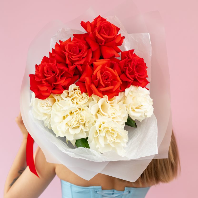 Красные и белые французские розы 11 шт