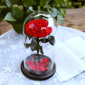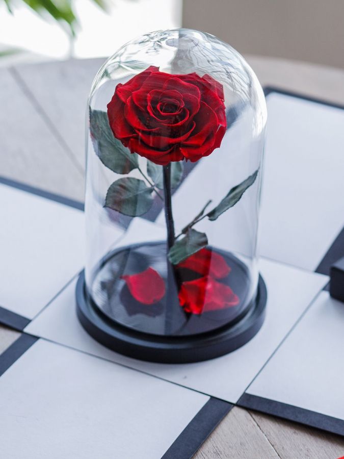 • Роза накрывается колбой из толстого стекла. Она защищает цветок от пыли и перепадов влаги.