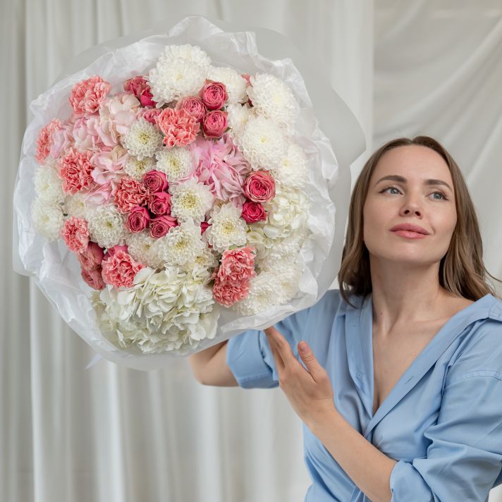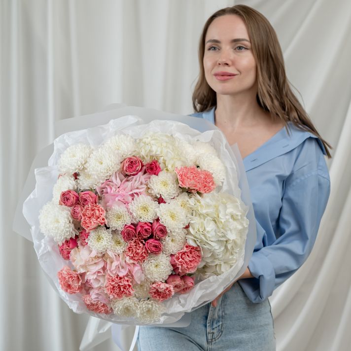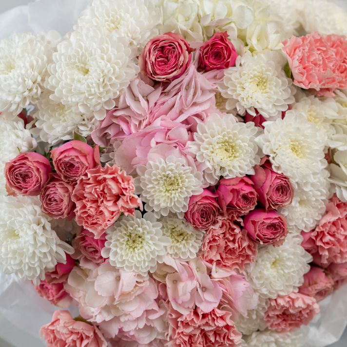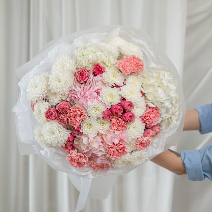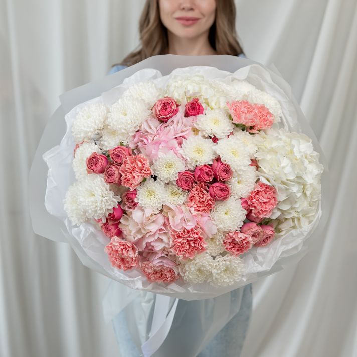 Алтай хриза - 6шт / Гортензия - 4шт / Кустовая пионовидная роза - 5шт / Диантус - 8шт / Упаковка - 1