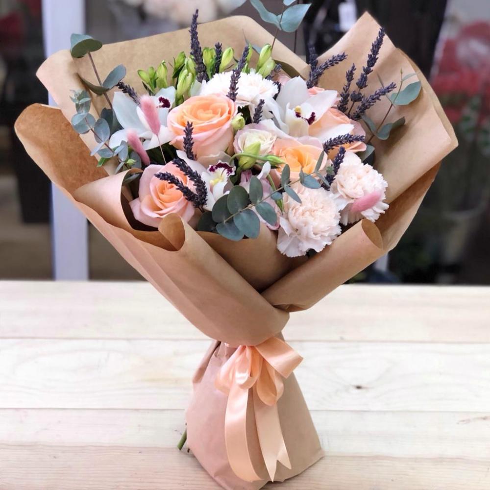 В составе букета: розы Эквадор, орхидеи, альстромерии, диантусы, зелень, лаванда, эустома, дизайнерская упаковка.