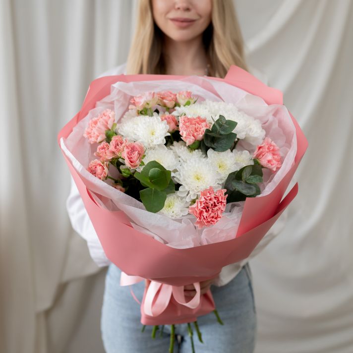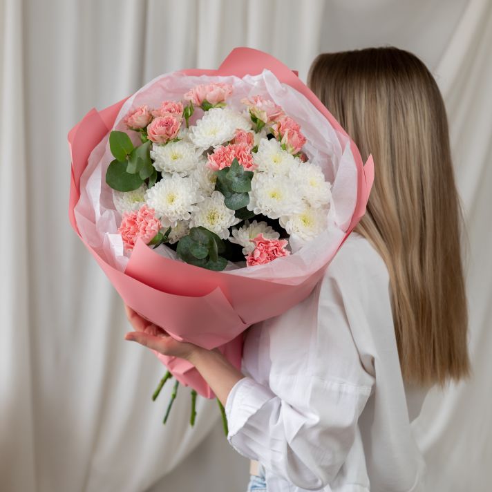 Алтай хриза - 3шт / Кустовая пионовидная роза - 2шт / Диантус - 5шт / Эвкалипт - 3шт / Упаковка - 1