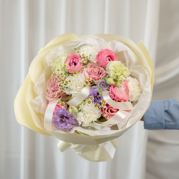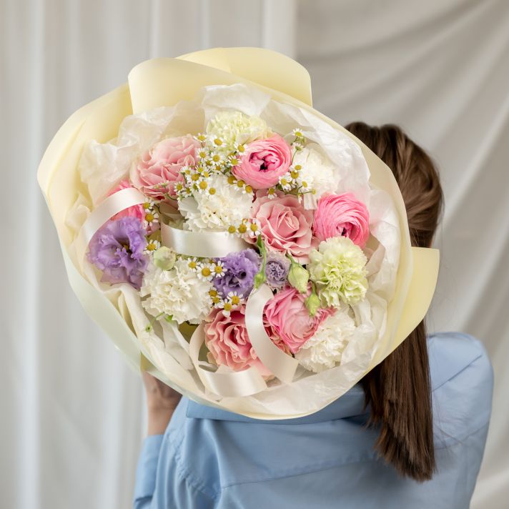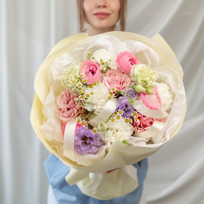 Пинк мондиаль - 3 шт Эустома - 1 шт Матрекария - 2 шт Раники - 4 шт Диантусы - 7 шт Упаковка - 1 шт