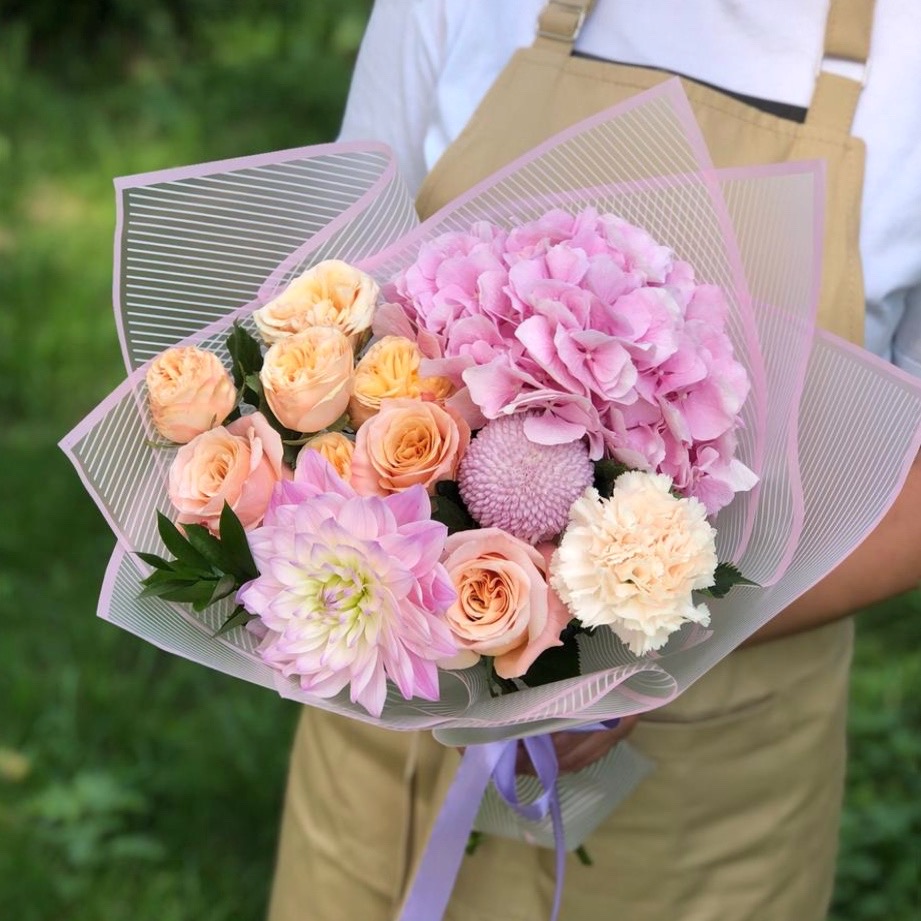 Нежный сборный букет с гортензией, георгином, розами, кустовой розой, диантусом и одноголовой хризантемой в красивой упаковке.