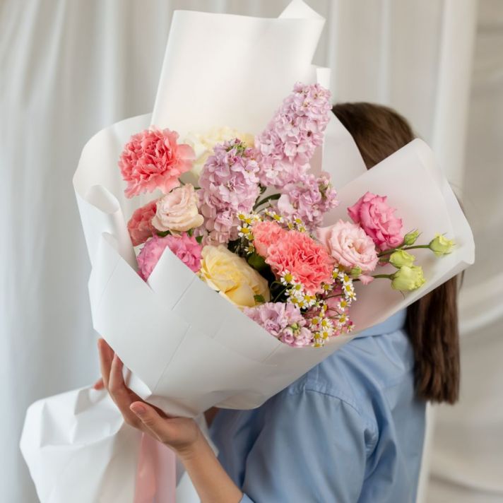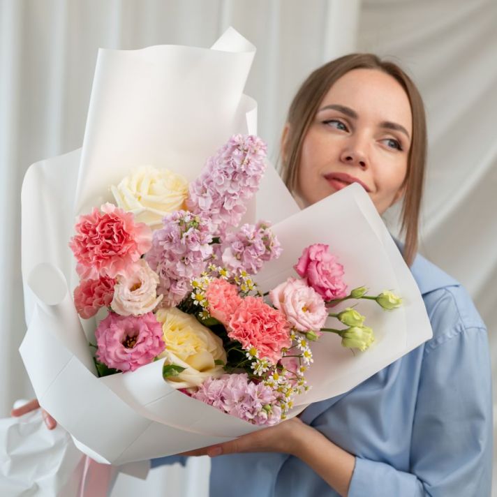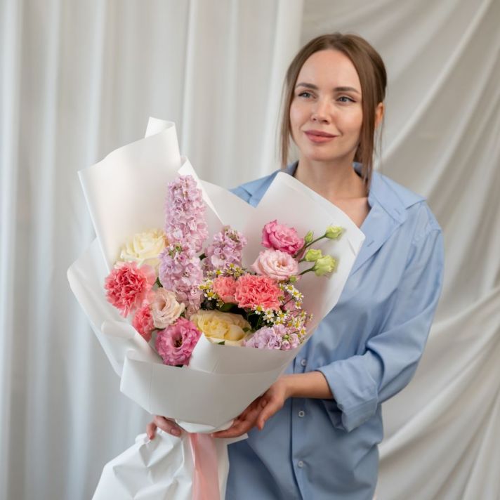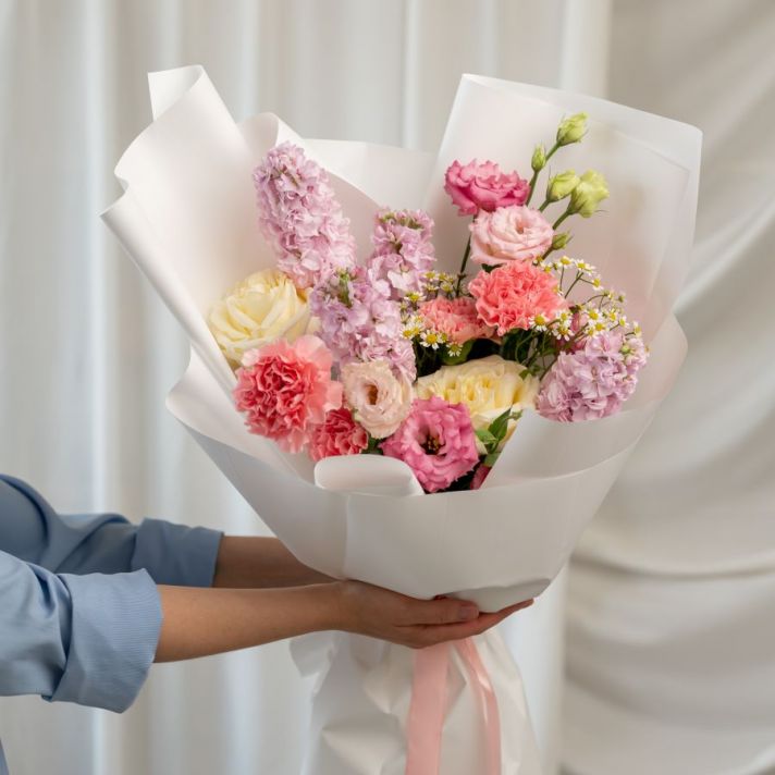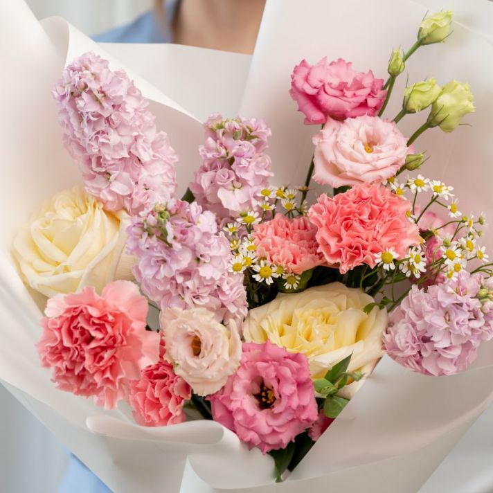 Маттиола 4 шт / диантусы 4 шт / эустома 2 шт / матрикария 2 шт / кендл лайт 2 шт