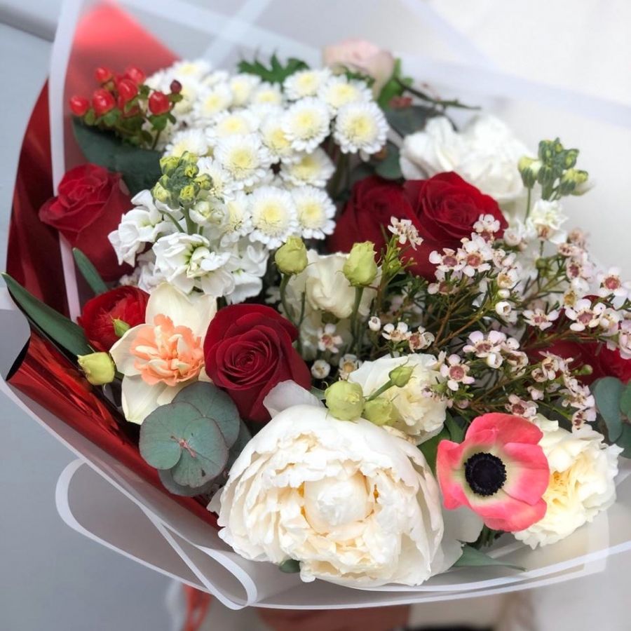 Сборный букет с пионом, маттиолой, анемонами, гиперикумом, нарциссами, эустомой и розами Эквадор.