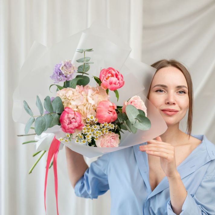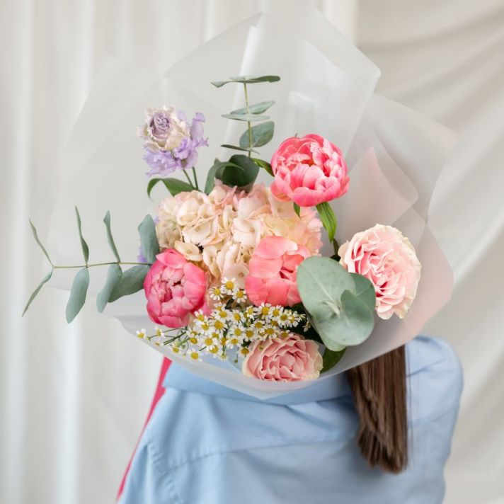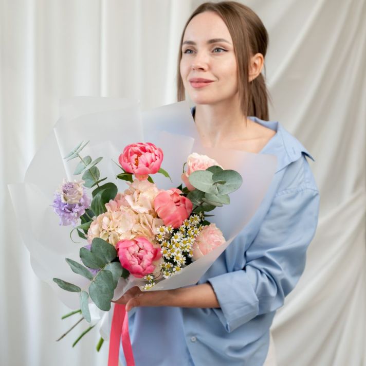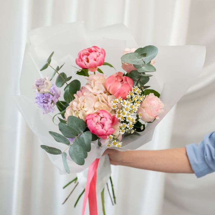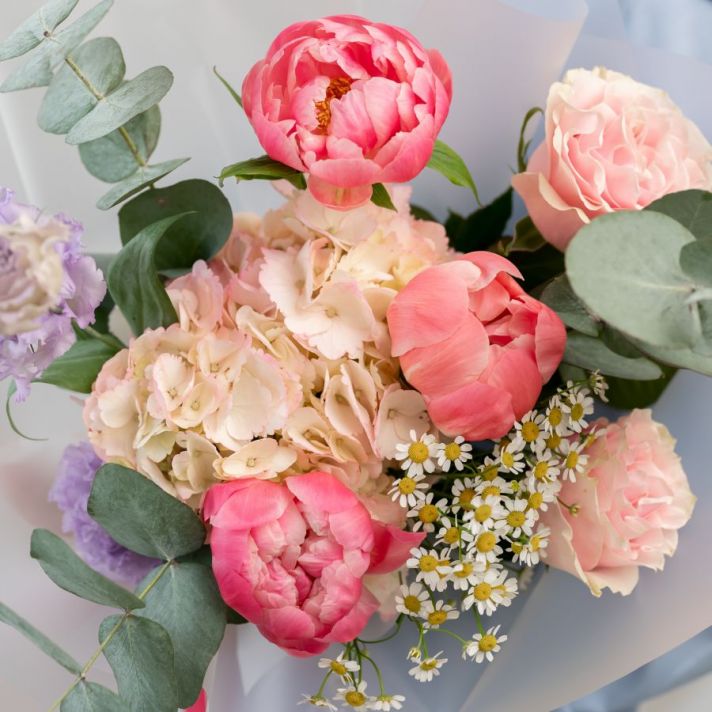 1 гортензия / 1 ромашка / 1 пиона корал шарм / 2 розы мондиаль / 1 эустома / эвкалипт