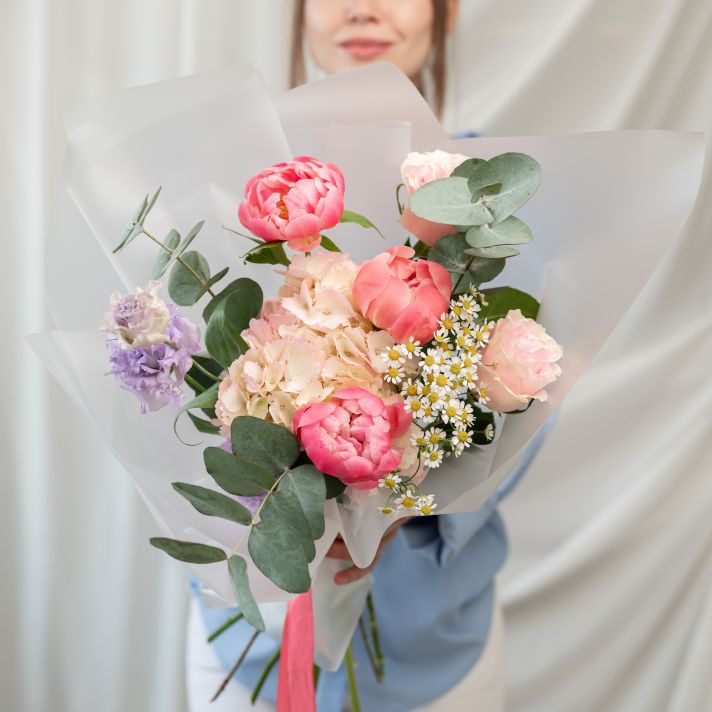 1 гортензия / 1 ромашка / 1 пиона корал шарм / 2 розы мондиаль / 1 эустома / эвкалипт