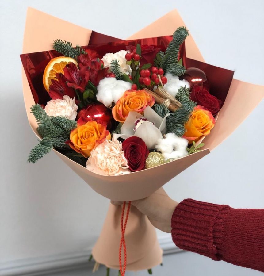 В составе букета: нобилис, розы Кения, орхидеи, альстромерия, диантусы, орхидея, гиперикум, хлопок, зимний декор, дизайнерская упаковка.